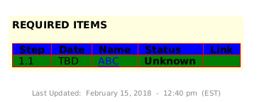 @startuml skinparam LegendBackgroundColor #lightyellow skinparam LegendBorderThickness 0 legend bottom <b>REQUIRED ITEMS</b> <#blue,#red>|= Step |= Date |= Name |= Status |= Link | <#green>| 1.1 | TBD | [[https://www.asdasd.com/apps/documents/items/1965 ABC]] |<color:black> <b>Unknown | | endlegend center footer \nLast Updated: February 15, 2018 - 12:40 pm (EST) @enduml