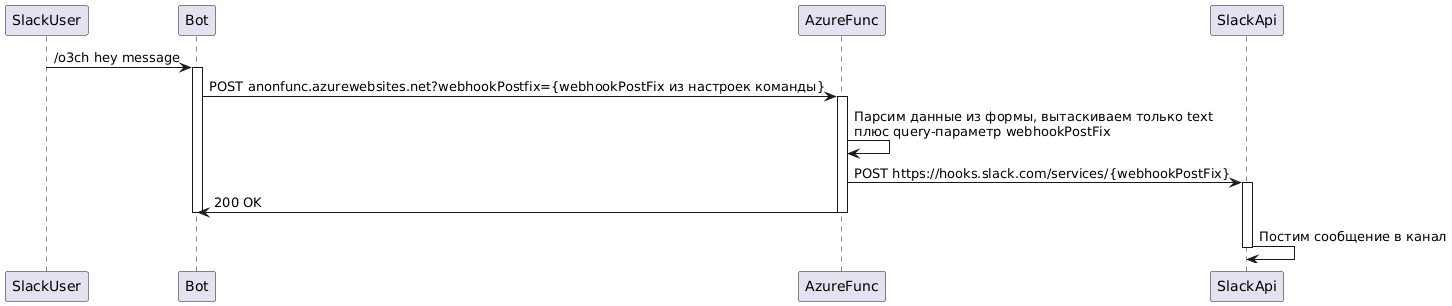 @startuml SlackUser->Bot: /o3ch hey message activate Bot Bot->AzureFunc: POST anonfunc.azurewebsites.net?webhookPostfix={webhookPostFix из настроек команды} activate AzureFunc AzureFunc->AzureFunc: Парсим данные из формы, вытаскиваем только text \nплюс query-параметр webhookPostFix AzureFunc->SlackApi: POST https://hooks.slack.com/services/{webhookPostFix} activate SlackApi AzureFunc->Bot: 200 OK deactivate AzureFunc deactivate Bot SlackApi->SlackApi: Постим сообщение в канал deactivate SlackApi @enduml
