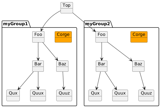 @startuml !unquoted procedure myGroup($as) object "Foo" as $as.Foo object "Bar" as $as.Bar object "Baz" as $as.Baz object "Qux" as $as.Qux object "Quux" as $as.Quux object "Quuz" as $as.Quuz object "Corge" as $as.Corge #orange $as.Foo --> $as.Bar $as.Foo --> $as.Baz $as.Bar --> $as.Qux $as.Bar --> $as.Quux $as.Baz --> $as.Quuz '$as.Baz --> $as.Corge !end procedure object Top myGroup(myGroup1) myGroup(myGroup2) 'myGroup(myGroup3) Top --> myGroup1.Foo Top --> myGroup2.Foo 'myGroup2.Bar--> myGroup3.Foo @enduml