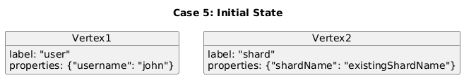 @startuml title Case 5: Initial State object Vertex1 { label: "user" properties: {"username": "john"} } object Vertex2 { label: "shard" properties: {"shardName": "existingShardName"} } @enduml