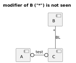 @startuml title modifier of B ("*") is not seen component "A" as A { } component "B" as B{ } component "C" as C { } B "*" -- C: BL A 0-0 C: test @enduml