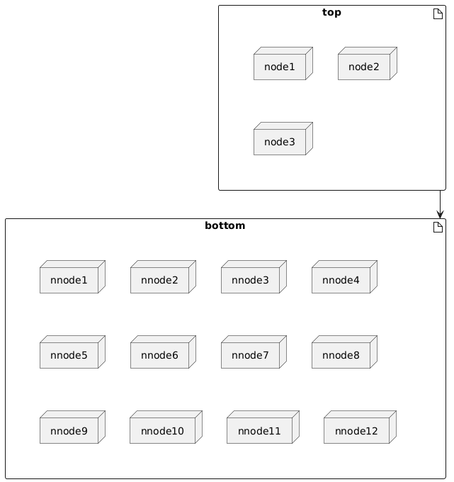 @startuml artifact top { label A as " {{ node node1 node node2 node node3 }} " } artifact bottom { label B as " {{ node nnode1 node nnode2 node nnode3 node nnode4 node nnode5 node nnode6 node nnode7 node nnode8 node nnode9 node nnode10 node nnode11 node nnode12 }} " } top --> bottom @enduml