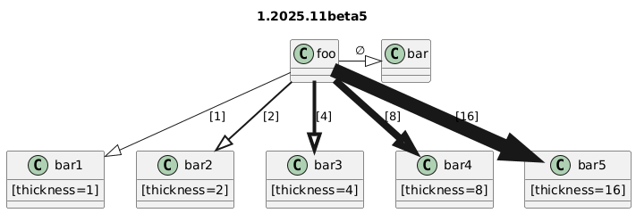 @startuml title %version() class foo class bar bar1 : [thickness=1] bar2 : [thickness=2] bar3 : [thickness=4] bar4 : [thickness=8] bar5 : [thickness=16] foo -|> bar : ∅ foo -[thickness=1]-|> bar1 : [1] foo -[thickness=2]-|> bar2 : [2] foo -[thickness=4]-|> bar3 : [4] foo -[thickness=8]-|> bar4 : [8] foo -[thickness=16]-|> bar5 : [16] @enduml