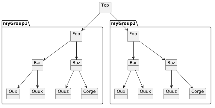 @startuml !unquoted procedure myGroup($as) object "Foo" as $as.Foo object "Bar" as $as.Bar object "Baz" as $as.Baz object "Qux" as $as.Qux object "Quux" as $as.Quux object "Quuz" as $as.Quuz object "Corge" as $as.Corge $as.Foo --> $as.Bar $as.Foo --> $as.Baz $as.Bar --> $as.Qux $as.Bar --> $as.Quux $as.Baz --> $as.Quuz $as.Baz --> $as.Corge !end procedure object Top myGroup(myGroup1) myGroup(myGroup2) Top --> myGroup1.Foo Top --> myGroup2.Foo @enduml