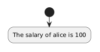 @startuml !$foo = { "company": "Skynet", "employees" : [ {"name" : "alice", "salary": 100 }, {"name" : "bob", "salary": 50} ] } start :The salary of $foo.employees[0].name is $foo.employees[0].salary; @enduml