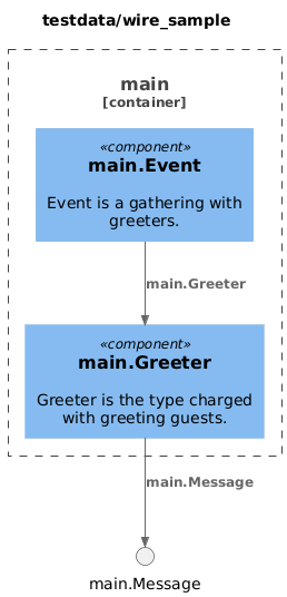 @startuml !include https://raw.githubusercontent.com/plantuml-stdlib/C4-PlantUML/master/C4_Component.puml title testdata/wire_sample Container_Boundary(main, "main") { Component(main.Greeter, "main.Greeter", "", "Greeter is the type charged with greeting guests.") Component(main.Event, "main.Event", "", "Event is a gathering with greeters.") } Rel(main.Greeter, main.Message, main.Message) Rel(main.Event, main.Greeter, main.Greeter) @enduml