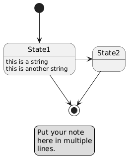 @startuml [*] --> State1 State1 --> [*] State1 : this is a string State1 : this is another string State1 -> State2 State2 --> [*] legend Put your note here in multiple lines. end legend @enduml
