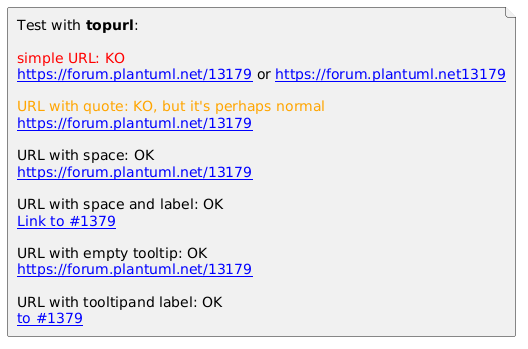 @startuml SkinParam topurl https://forum.plantuml.net file F [ Test with **topurl**: <color:red>simple URL: KO [[/13179]] or [[13179]] <color:orange>URL with quote: KO, but it's perhaps normal [["/13179"]] URL with space: OK [[/13179 ]] URL with space and label: OK [[/13179 Link to #1379]] URL with empty tooltip: OK [[/13179{}]] URL with tooltipand label: OK [[/13179{tooltip}Link to #1379]] ] @enduml