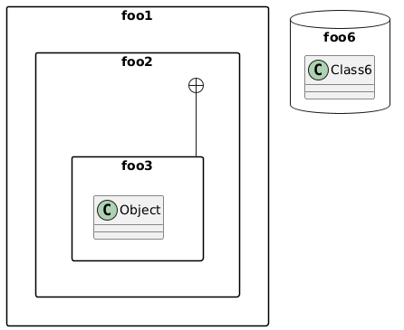 @startuml skinparam packageStyle rectangle namespace foo1.foo2 { } namespace foo1.foo2.foo3 { class Object } foo1.foo2 +-- foo1.foo2.foo3 namespace foo6 <<Database>> { class Class6 } @enduml