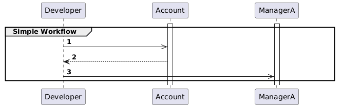 @startuml skinparam ParticipantPadding 60 autonumber participant Developer participant Account participant ManagerA activate ManagerA activate Account group Simple Workflow Developer->>Account Account-->Developer Developer->>ManagerA end @enduml