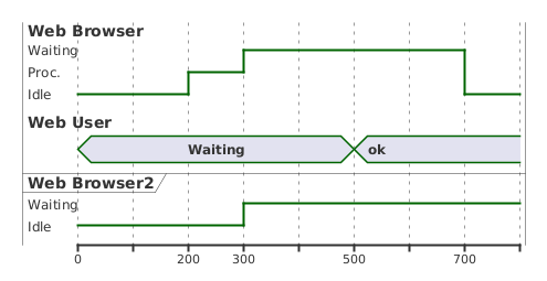@startuml compact robust "Web Browser" as WB compact concise "Web User" as WU robust "Web Browser2" as WB2 @0 WU is Waiting WB is Idle WB2 is Idle @200 WB is Proc. @300 WB is Waiting WB2 is Waiting @500 WU is ok @700 WB is Idle @enduml