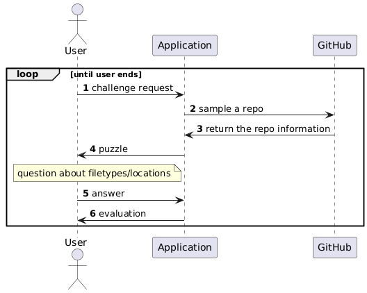 @startuml autonumber actor User as user participant "Application" as app participant "GitHub" as github loop until user ends user -> app: challenge request app -> github: sample a repo github -> app: return the repo information app -> user: puzzle note left of app: question about filetypes/locations user -> app: answer app -> user: evaluation end @enduml
