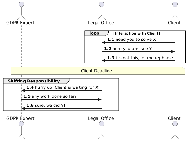 @startuml autonumber 1.1 Actor expert as "GDPR Expert" Actor office as "Legal Office" Actor client as "Client" loop Interaction with Client client -> office: need you to solve X office -> client: here you are, see Y client -> office: it's not this, let me rephrase end loop note across: Client Deadline group Shifting Responsibility office -> expert: hurry up, Client is waiting for X! expert -> office: any work done so far? office -> expert: sure, we did Y! end @enduml