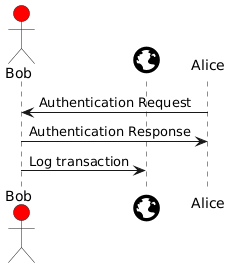 @startuml skinparam participant { Bordercolor none Backgroundcolor none Shadowing false } actor Bob #red ' The only difference between actor 'and participant is the drawing participant "<size:40><&globe>" as L Alice->Bob: Authentication Request Bob->Alice: Authentication Response Bob->L: Log transaction @enduml