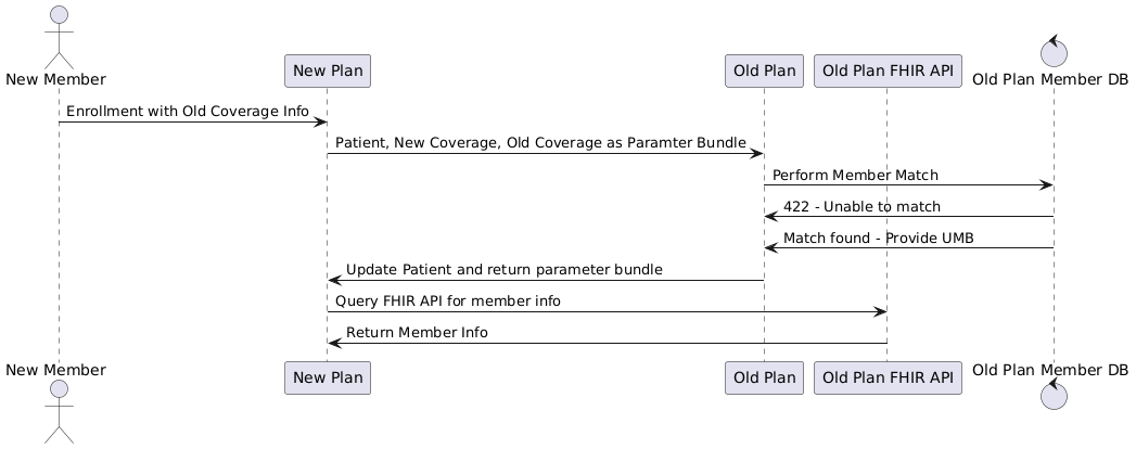 @startuml actor NM as "New Member" participant NP as "New Plan" participant OP as "Old Plan" participant OF as "Old Plan FHIR API" control PS as "Old Plan Member DB" NM -> NP: Enrollment with Old Coverage Info NP -> OP: Patient, New Coverage, Old Coverage as Paramter Bundle OP -> PS: Perform Member Match PS -> OP: 422 - Unable to match PS -> OP: Match found - Provide UMB OP -> NP: Update Patient and return parameter bundle NP -> OF: Query FHIR API for member info OF -> NP: Return Member Info @enduml