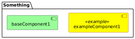 @startuml hide stereotype show <<example>> stereotype skinparam component { BackgroundColor<<base>> #99ff99 BorderColor<<base>> Black BackgroundColor<<example>> Yellow BorderColor<<example>> Maroon } package "Something" { [baseComponent1]<<base>> [exampleComponent1]<<example>> } @enduml