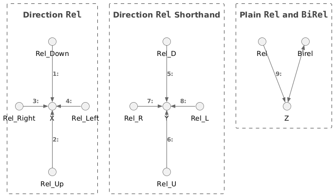 @startuml !include https://raw.githubusercontent.com/kirchsth/C4-PlantUML/extended/C4_Dynamic.puml Boundary(a, 'Direction ""Rel""'){ Rel_Down( Rel_Down, X, "") Rel_Up( Rel_Up, X, "") Rel_Right(Rel_Right, X, "") Rel_Left( Rel_Left, X, "") } Boundary(b, 'Direction ""Rel"" Shorthand'){ Rel_D(Rel_D, Y, "") Rel_U(Rel_U, Y, "") Rel_R(Rel_R, Y, "") Rel_L(Rel_L, Y, "") } Boundary(c, 'Plain ""Rel"" and ""BiRel""'){ Rel(Rel, Z, "") BiRel(Birel, Z, "") } @enduml