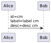 @startuml !unquoted function $lookup($id) !$data={"participants":[ {"id": "cm", "label": "label cm", "desc": "desc cm"}, {"id": "tm", "label": "label tm", "desc": "desc tm"}, {"id": "am", "label": "label am", "desc": "desc am"} ]} !foreach $part in $data.participants !if $part.id == $id !return "id=" + $part.id + " \nlabel=" + $part.label + "\ndesc=" + $part.desc !endif !endfor !endfunction !$a="cm" Alice -> Bob : $lookup($a) @enduml