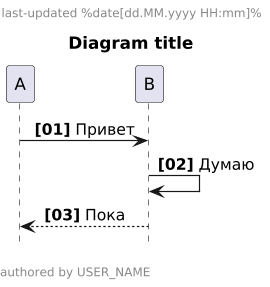 @startuml title Diagram title hide footbox scale 1.2 !define GENERATION_DATE %date[dd.MM.yyyy HH:mm]% header last-updated GENERATION_DATE left footer \n\nauthored by USER_NAME skinparam sequenceMessageAlign reversedirection skinparam defaultTextAlignment center skinparam noteTextAlignment center autonumber "<b>[00]" 'Diagram steps A -> B : Привет B -> B : Думаю B --> A: Пока @enduml