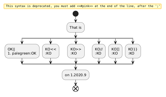 @startuml skinparam Backgroundcolor transparent !$a="#pink:KO" start :That is; split :OK|| #palegreen:OK; split again $a<< :KO; split again $a>> :KO; split again $a// :KO; split again $a]] :KO; split again $a}} :KO; split end :on 1.2020.9; end @enduml