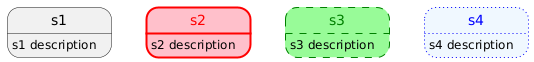 @startuml state s1 : s1 description state s2 #pink;line:red;line.bold;text:red : s2 description state s3 #palegreen;line:green;line.dashed;text:green : s3 description state s4 #aliceblue;line:blue;line.dotted;text:blue : s4 description @enduml