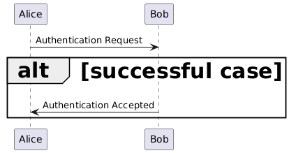 @startuml skinparam sequenceGroupFontSize 30 skinparam sequenceGroupHeaderFontSize 30 Alice -> Bob: Authentication Request alt successful case Bob -> Alice: Authentication Accepted end @enduml