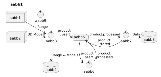 @startuml skinparam ranksep 5 skinparam nodesep 5 rectangle "aabb1" { node aabb1 as a1 node aabb2 as a2 } a1 --[hidden]> a2 control "aabb3" as a3 database "aabb4" as a4 queue "aabb5" as a5 control "aabb6" as a6 control "aabb7" as a7 database "aabb8" as a8 control "aabb9" as a9 a1 -right-> a3: Range a2 -right-> a3: 3D Models a3 -down-> a4: Range & Models a3 -> a5: product.\nupsert a5 -down-> a6: product.\nupsert a6 -> a5: product.\nprocessed a5 -> a7: product.processed a7 -> a8: Data a7 -> a5: product.\nstored 'a5 -up-> a9: product.stored @enduml