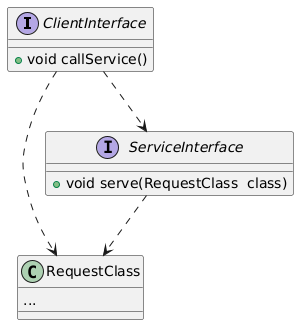 @startuml interface ClientInterface { + void callService() } class RequestClass { ... } interface ServiceInterface { + void serve(RequestClass class) } ClientInterface ..> ServiceInterface ClientInterface ..> RequestClass ServiceInterface ..> RequestClass @enduml