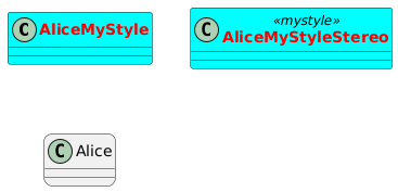 @startuml <style> classDiagram { RoundCorner 15 .mystyle { RoundCorner 5 BackgroundColor cyan FontStyle Bold FontColor red } } </style> class AliceMyStyle <<<mystyle>>> class AliceMyStyleStereo <<mystyle>> class Alice @enduml