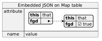 @startuml map "Embedded JSON on Map table" as mapper { attribute => {{json\n{"this":"that","fgd": {"this":"that","fgd":true}}\n}} name => value } @enduml