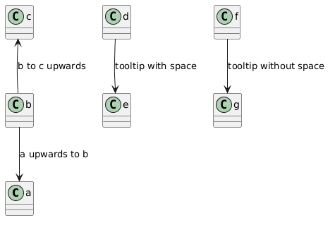 @startuml class a class b class c class d class e a <-up- b [[tooltip]] : a upwards to b b -up-> c [[tooltip]] : b to c upwards d --> e [[tooltip hello]] : tooltip with space f --> g [[tooltip,hello]] : tooltip without space @enduml