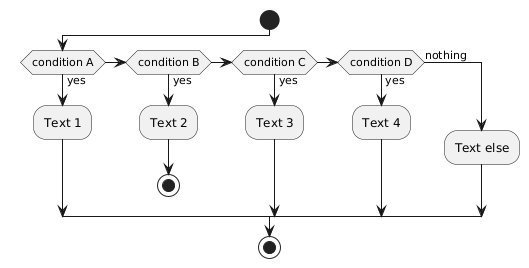 @startuml start if (condition A) then (yes) :Text 1; elseif (condition B) then (yes) :Text 2; stop elseif (condition C) then (yes) :Text 3; elseif (condition D) then (yes) :Text 4; else (nothing) :Text else; endif stop @enduml
