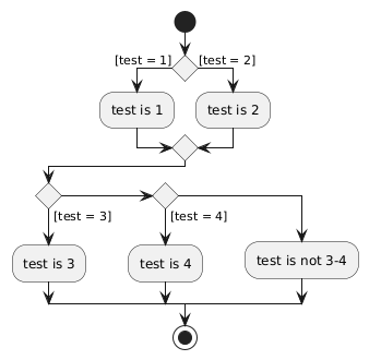 @startuml start if () then ([test = 1]) :test is 1; else ([test = 2]) :test is 2; endif if () then ([test = 3]) :test is 3; else if () then ([test = 4]) :test is 4; else :test is not 3-4; endif stop @enduml