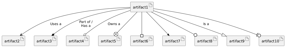 @startuml artifact artifact1 artifact artifact2 artifact artifact3 artifact artifact4 artifact artifact5 artifact artifact6 artifact artifact7 artifact artifact8 artifact artifact9 artifact artifact10 artifact1 --> artifact2 : "Uses a" artifact1 --* artifact3 : "Part of /\nHas a" artifact1 --o artifact4 : "Owns a" artifact1 --+ artifact5 artifact1 --# artifact6 artifact1 -->> artifact7 artifact1 --0 artifact8 artifact1 --^ artifact9 : "Is a" artifact1 --(0 artifact10 @enduml