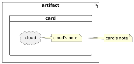 @startuml artifact artifact { card card { label label [ {{ cloud cloud note right: cloud's note }} ] } } note right: card's note @enduml