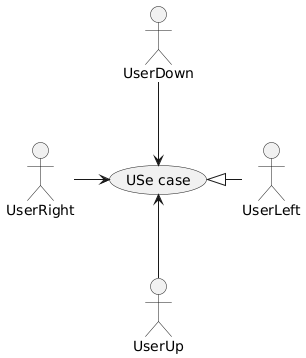 @startuml UserLeft -L-|> (USe case) UserRight -R-> (USe case) UserUp -U-> (USe case) UserDown -D-> (USe case) @enduml