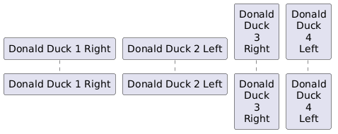 @startuml participant DonaldDuck1Left as "Donald Duck 1 Right" participant "Donald Duck 2 Left" as DonaldDuck2Right participant DonaldDuck3Left as "Donald\nDuck\n3\nRight" participant "Donald\nDuck\n4\nLeft" as DonaldDuck4Right @enduml