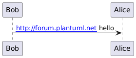 @startuml participant Bob [[http://plantuml.com]] Bob -> Alice : [[http://forum.plantuml.net]] hello @enduml