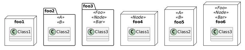 @startuml package foo1 <<Node>> { class Class1 } package foo2 <<A>><<B>> { class Class2 } package foo3 <<Foo>><<Node>><<Bar>> { class Class3 } node foo4 <<Node>> { class Class1 } node foo5 <<A>><<B>> { class Class2 } node foo6 <<Foo>><<Node>><<Bar>> { class Class3 } @enduml
