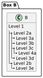 @startuml package "Box B" { class B { Level 1 |_ Level 2a |_ Level 3a |_ Level 3b |_ Level 3c |_ Level 4a |_ Level 3d |_ Level 2b |_ Level 3e } } @enduml