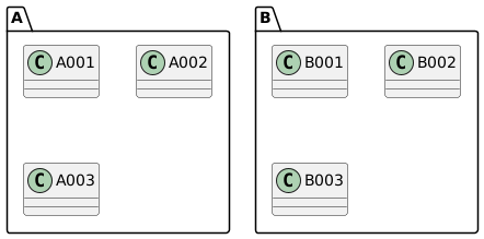 @startuml package A { class A001 class A002 class A003 } package B { class B001 class B002 class B003 } hide A002 remove B002 @enduml