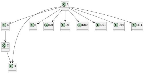 @startuml scale 500 width class A class B A --> B B --> C C --> D A --> D A --> E A --> D0 A --> D1 A --> D00 A --> D01 A --> D10 A --> D11 @enduml