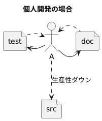 @startuml title 個人開発の場合 actor A file src file test file doc A -l-> test A -r-> doc test .r.> A doc .l.> A A .d.> src: 生産性ダウン @enduml