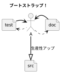 @startuml title ブートストラップ! actor A file src file test file doc A .l.> test A .r.> doc test =r=> A doc =l=> A A =d=|> src: 生産性アップ @enduml
