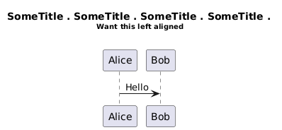 @startuml title SomeTitle . SomeTitle . SomeTitle . SomeTitle . <font size=10> Want this left aligned</font> endtitle Alice -> Bob: Hello @enduml