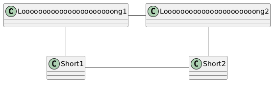 @startuml top to bottom direction class Loooooooooooooooooooooong1 class Loooooooooooooooooooooong2 class Short1 class Short2 Loooooooooooooooooooooong1 -r- Loooooooooooooooooooooong2 Short1 -[norank]- Short2 Loooooooooooooooooooooong1 -d- Short1 Loooooooooooooooooooooong2 -d- Short2 @enduml