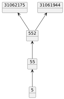 @startuml together { object 31062175 object 31061944 } together { object 552 } together { object "55" as 9108<< (G,#FF7700) >> } together { object "5" as 2325<< (R,#AA7700) >> } 552<--"9108" "2325"-u->"9108" 31062175<--552 31061944<--552 @enduml