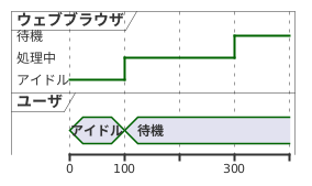 @startuml robust "ウェブブラウザ" as WB concise "ユーザ" as WU @0 WU is アイドル WB is アイドル @100 WU is 待機 WB is 処理中 @300 WB is 待機 @enduml