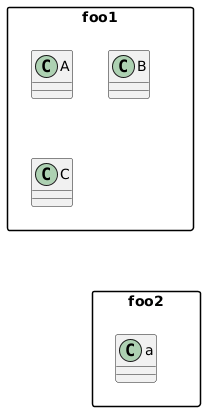 @startuml skinparam packageStyle rectangle package foo1 { class A class B class C } package foo2 { class a } foo1 --[hidden]--> foo2 @enduml