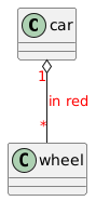 @startuml skinparam ArrowFontColor red car "1" o-- "*" wheel : in red @enduml